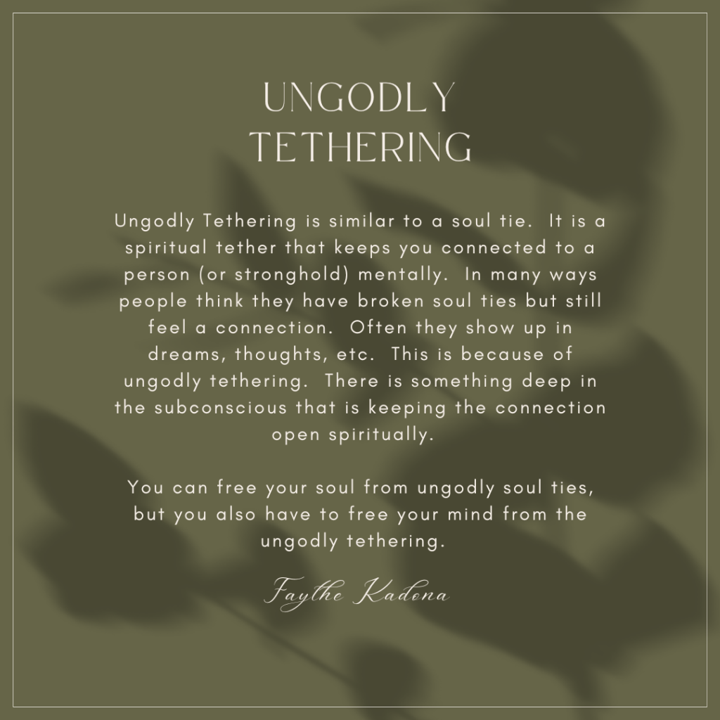 Ungodly Tethering is similar to a soul tie. It is a spiritual tether that keeps you connected to a person mentally. In many ways people think they have broken soul ties but still feel a connection to that person. Often they show up in dreams, thoughts, etc. This is because of ungodly tethering. There is something deep in the subconscious that is keeping the connection open spiritually. You see, similar to the example from the movie, we connect with people not just on a soul level, but on a mental and emotional level. While our soul connects so does our mind. This is where people who are narcissistic and emotionally abusive are able to reframe the mind of another person and become controlling, while those who are not so manipulated by that person don’t understand the power they hold over the mind. There is a mental tethering that is deep in the recess of the subconscious that must be broken.